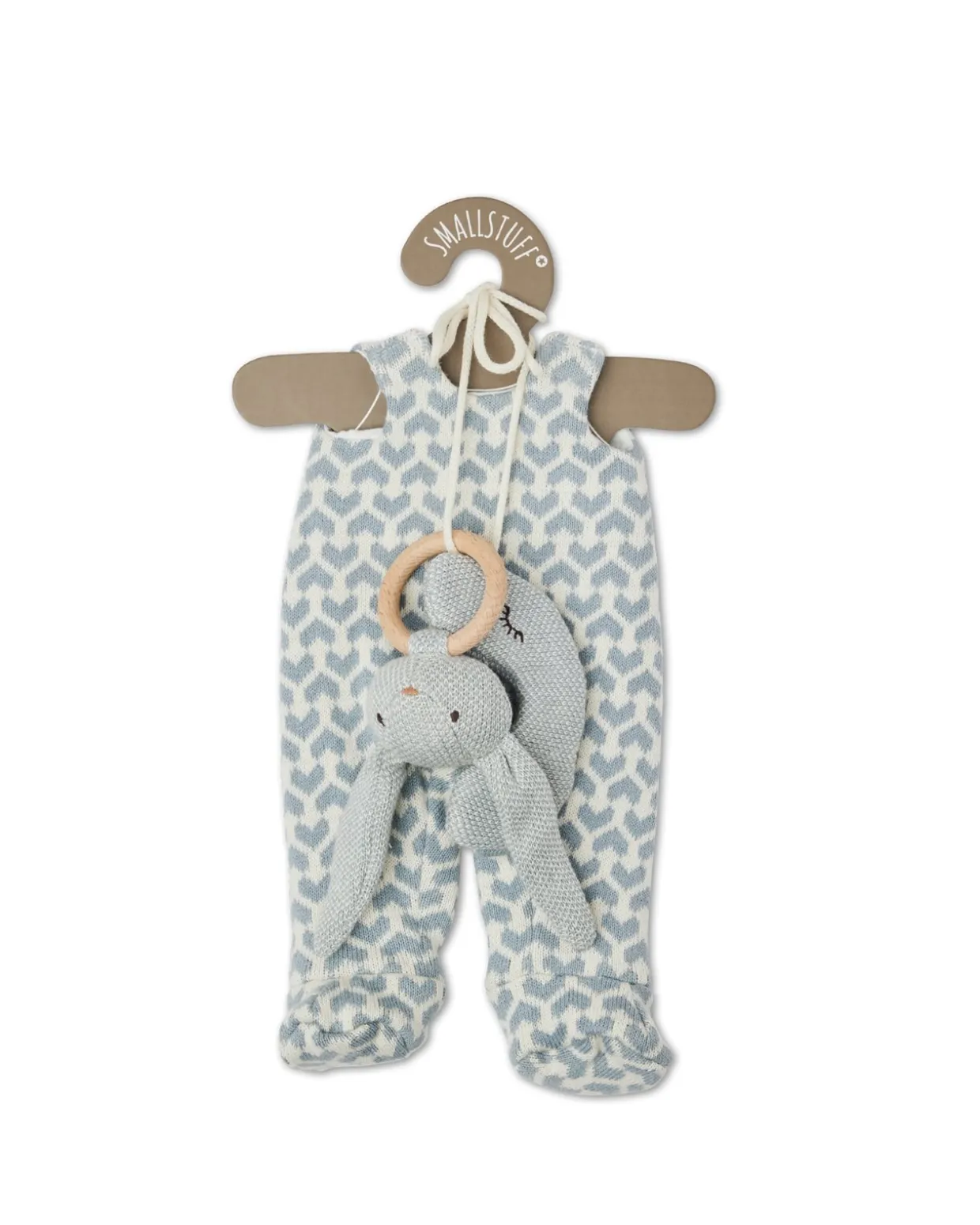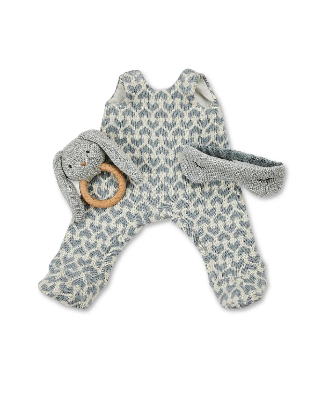- Strikket sparkedragt med hjertemotiv,sovebriller og sød lille kanin rangle