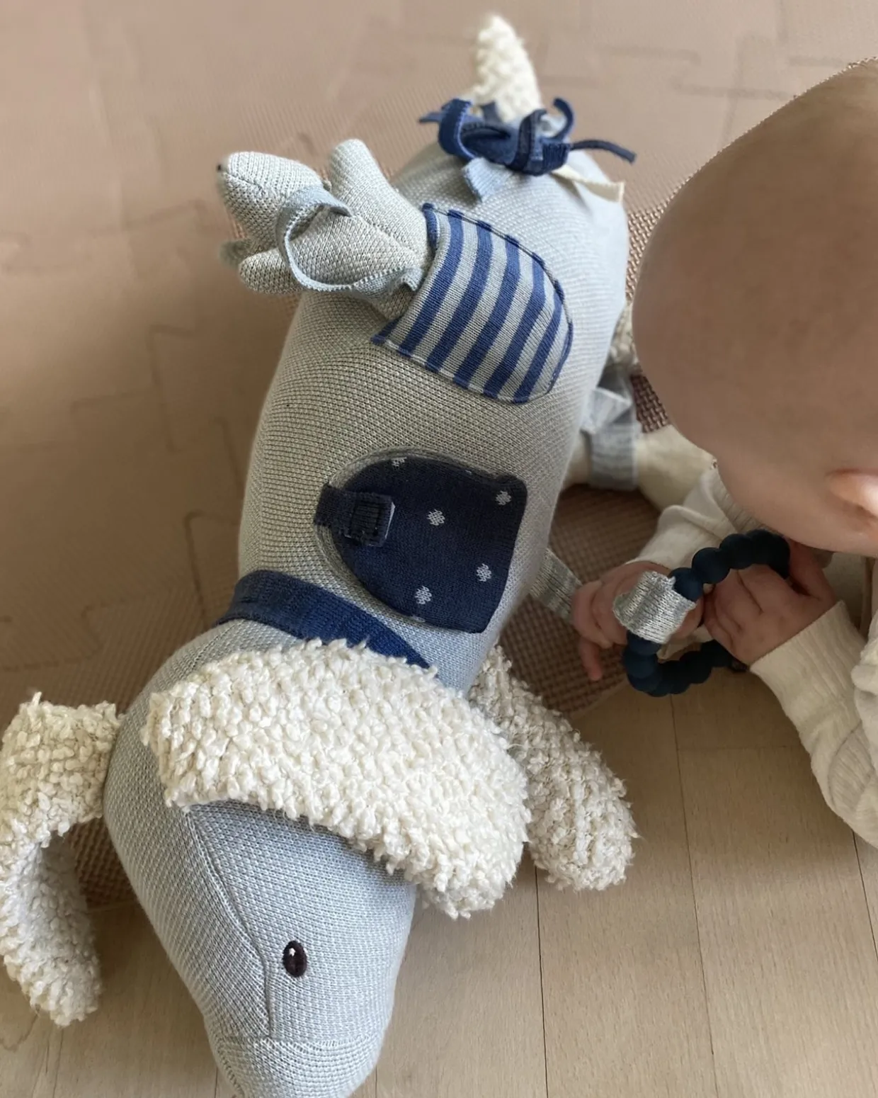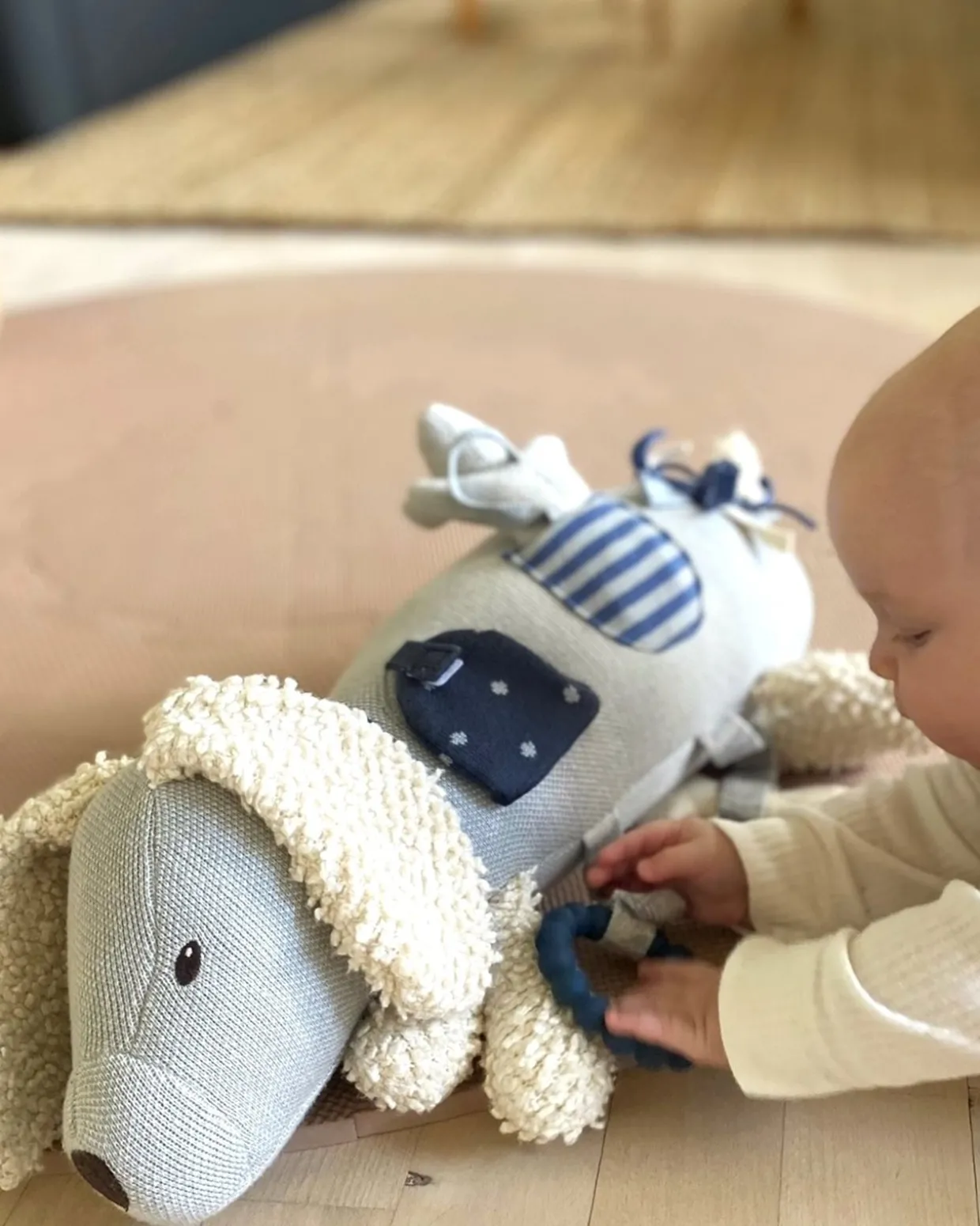 - Den har klokker i benene, kratte lyd i ørerne, silikone bidering ved maven, spejl bag den lille låge, lille hund i lomme og kødben med båtlyd. Alle detaljer der vækker barnets sanser og bidrager til mange timers leg.